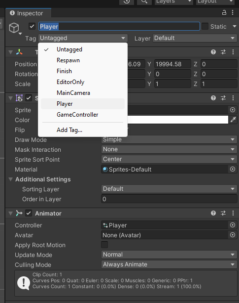 11 คลิกที่ตัวละคร ทางขวามือที่ Inspector เปลี่ยนชื่อเป็น Player ที่ช่อง Tag เปลี่ยนจาก Untagged เป็น Player
