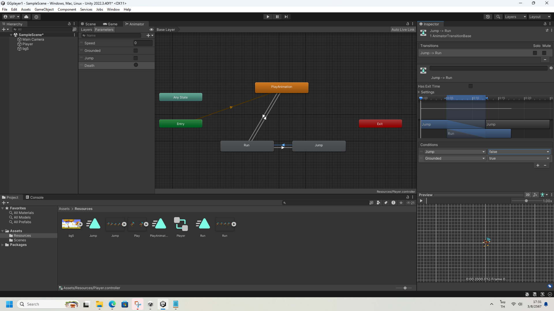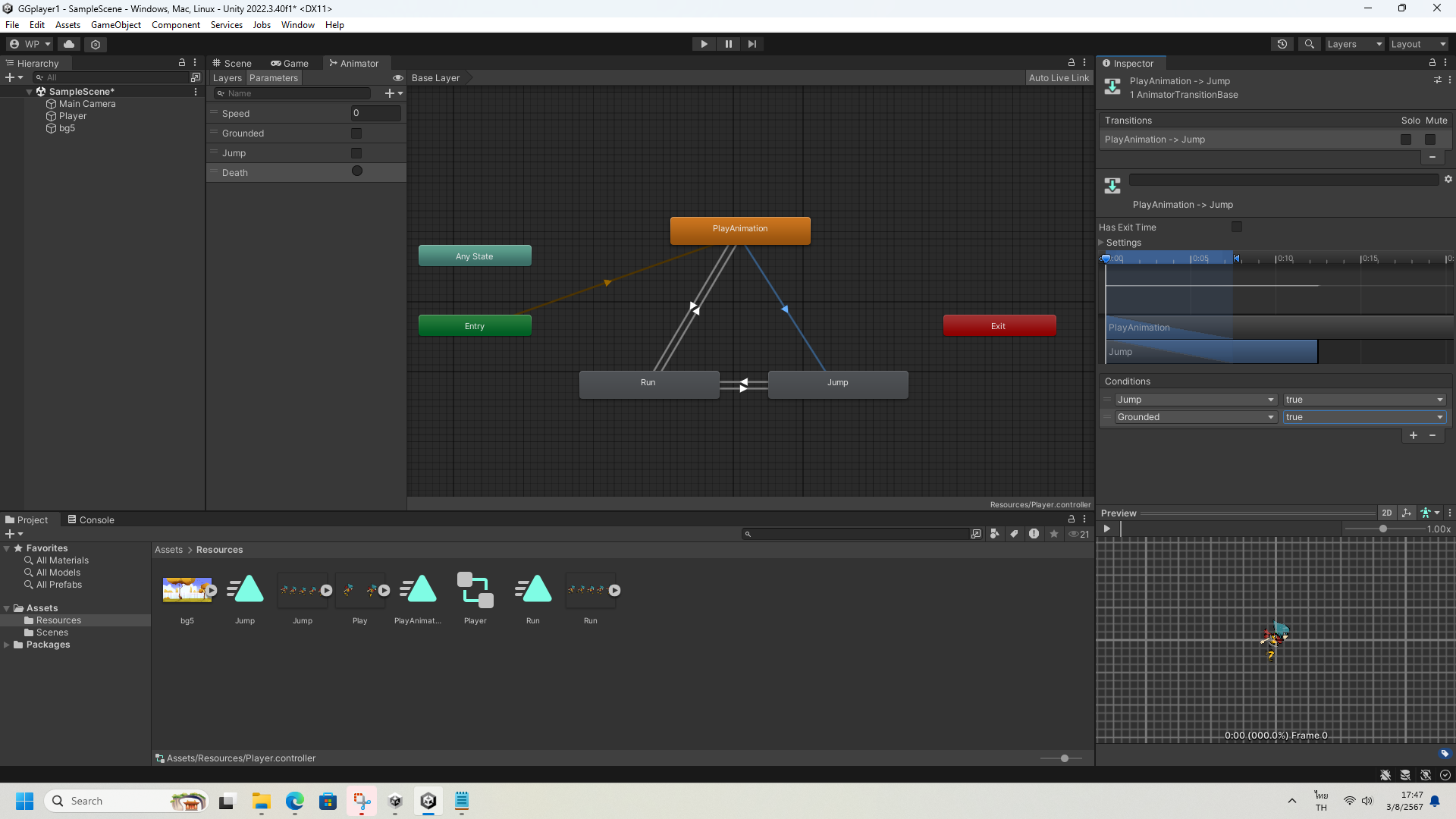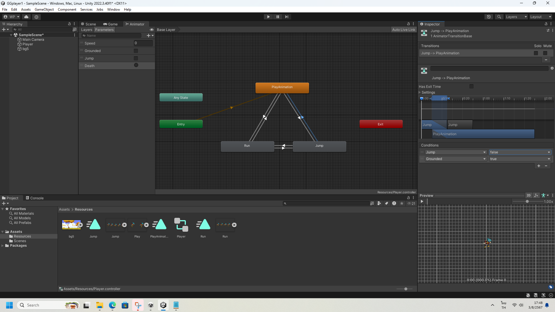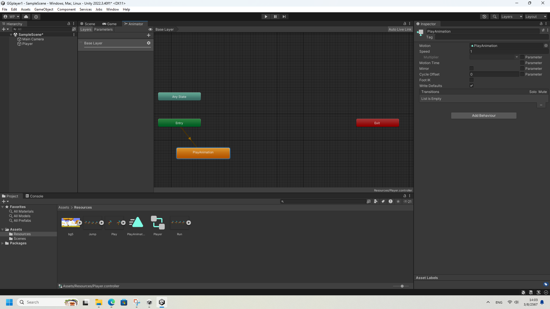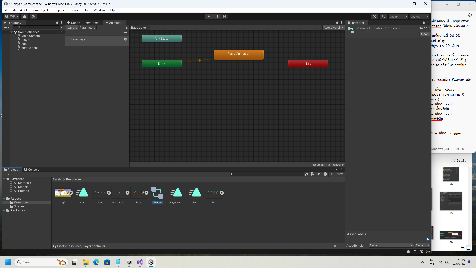37 ที่โฟลเดอร์ Resources ด้านล่างโปรแกรม คลิกที่ตัว Player เปิดหน้าต่าง Animator