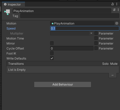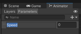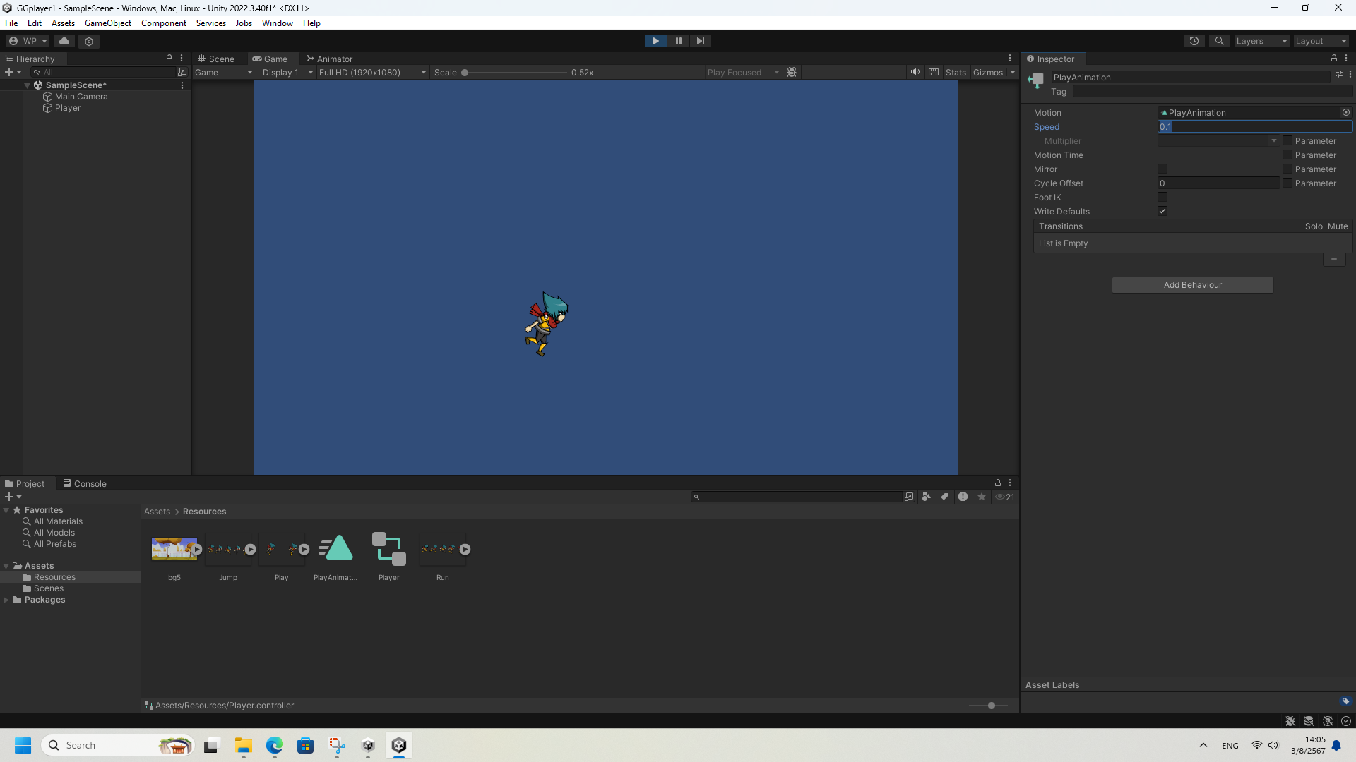 12 คลิกที่ Animator คลิกที่ปุ่ม PlayAnimation ทางขวามือที่ Inspector ช่อง Speed ปรับความเร็วการเคลื่อนไหวตัวละครตามชอบ