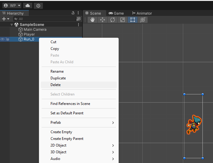 15 ที่โฟลเดอร์ Resources คลิกที่ตัวละคร Run เพื่อสร้างการเคลื่อนไหวแบบ วิ่ง ทำตามขั้นตอนที่ 5-7 โปรแกรมจะสร้างชนิดการเคลื่อนไหวเป็น Animation ให้ตั้งชื่อ Run จากนั้นตัวละครจะปรากฎบน Scene