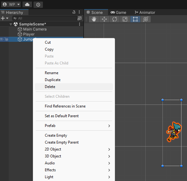 17 ที่โฟลเดอร์ Resources คลิกที่ตัวละคร Jump เพื่อสร้างการเคลื่อนไหวแบบ กระโดด ทำตามขั้นตอนที่ 5-7 โปรแกรมจะสร้างชนิดการเคลื่อนไหวเป็น Animation ให้ตั้งชื่อ Jump จากนั้นตัวละครจะปรากฎบน Scene