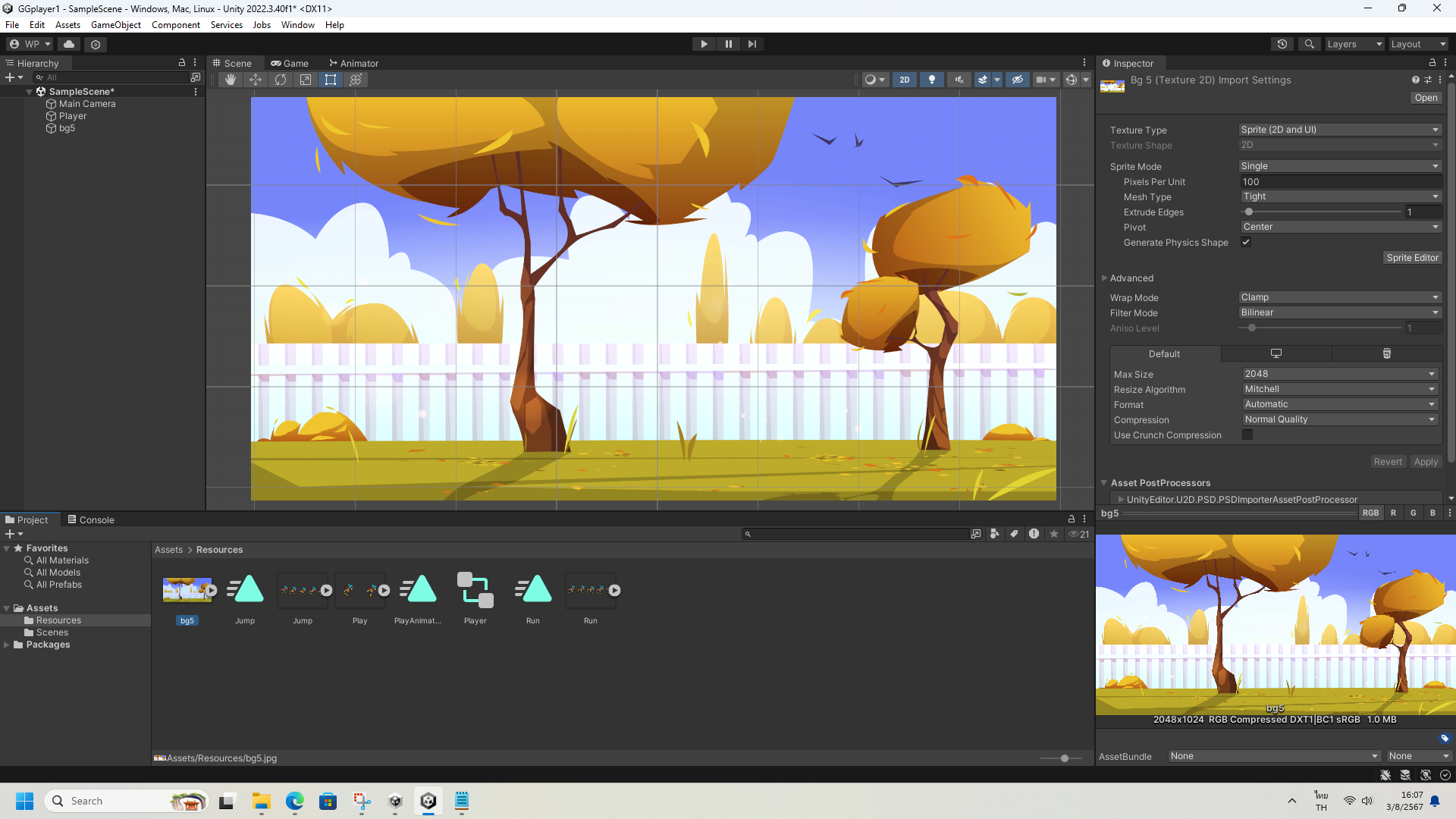 9 โปรแกรมจะสร้างชนิดการเคลื่อนไหวเป็น Animation ให้ตั้งชื่อ PlayerAnimation จากนั้นตัวละครจะปรากฎบน Scene