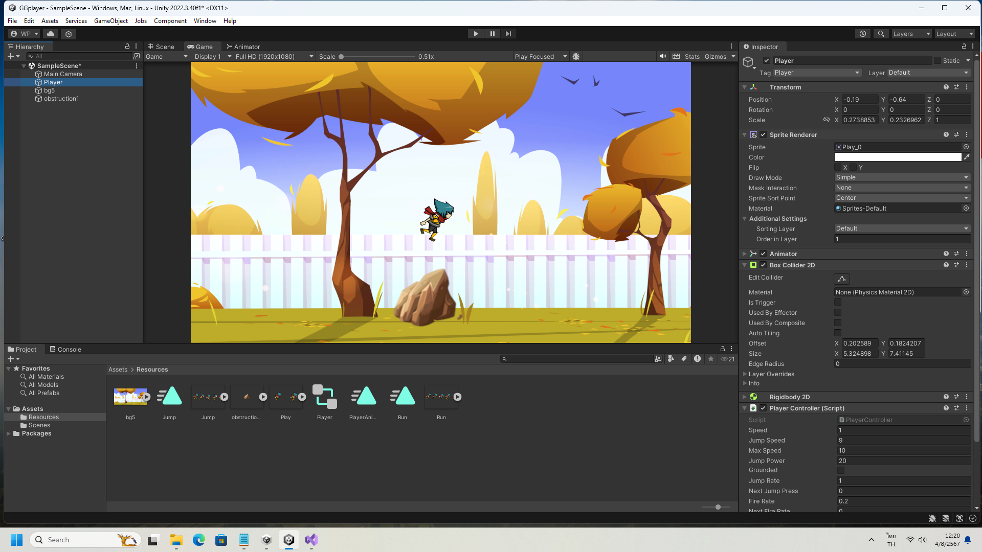 22 หากฉากบังตัวละคร หรือสิ่งกีดขวาง ให้คลิกที่ Player หรือ obstruction1 และที่ Inspector ที่ช่อง Order in Layer เปลี่ยนจาก 0 เป็น 1 (1 ให้เลเยอร์นั้นๆ อยู่ข้างหน้า)