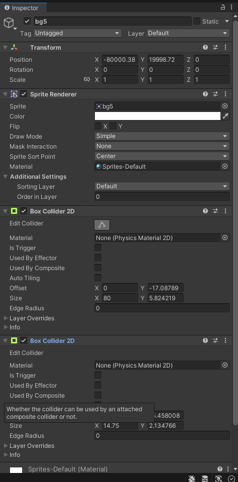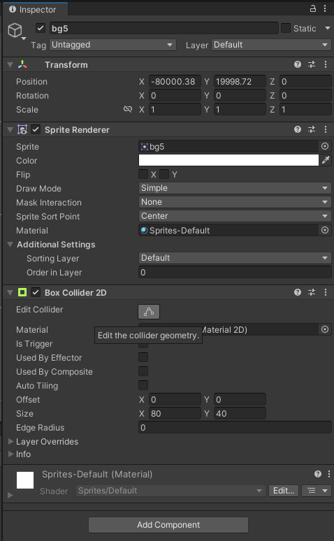 25 ทำการสร้างพื้นสำหรับการ เดิน วิ่ง กระโดด ของตัวละคร คลิกที่ bg5 ทางขวามือที่ Inspector ที่ปุ่ม Add Component