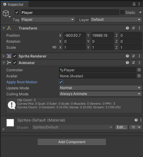 31 คลิกที่ Player เพื่อสร้างการเคลื่อนไหวให้ตัวละคร ที่ Inspector ในส่วนของ Animator ที่ Apply Root Mction ให้เช็คเครื่องหมายถูก