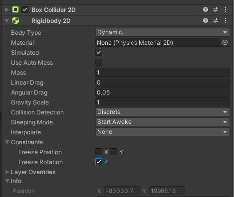 35 ที่ Rigidbody 2D ที่สร้าง ไปที่ช่อง Constraints ที่ Freeze Rotation ทำเครื่องหมายเช็คถูก หน้าช่อง Z (เพื่อให้เดินแล้วไม่ล้ม)