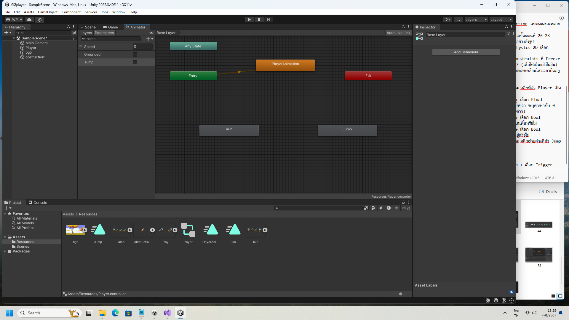 44 ที่โฟลเดอร์ Resources ด้านล่างโปรแกรม คลิกซ้ายค้างที่ตัว Jump และ Run ลากไปวางบนหน้าต่าง Animator