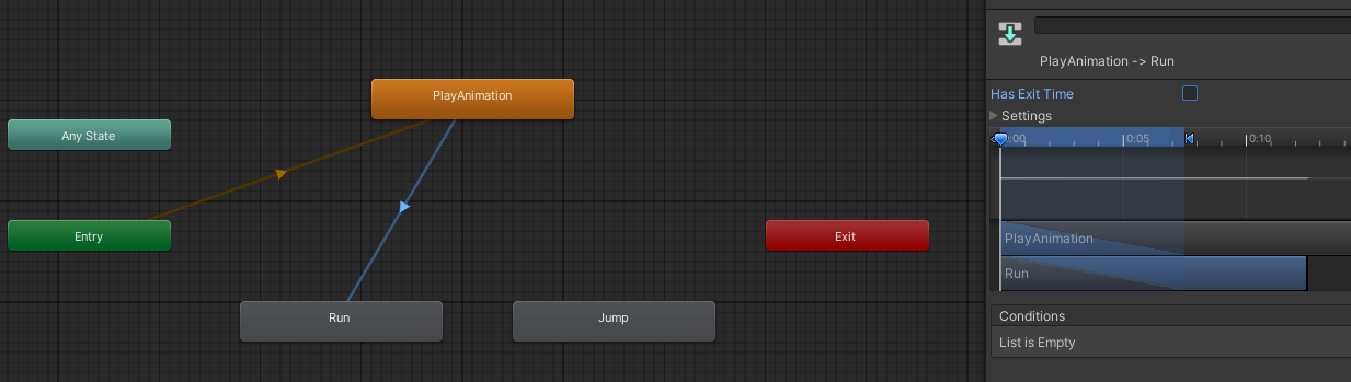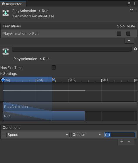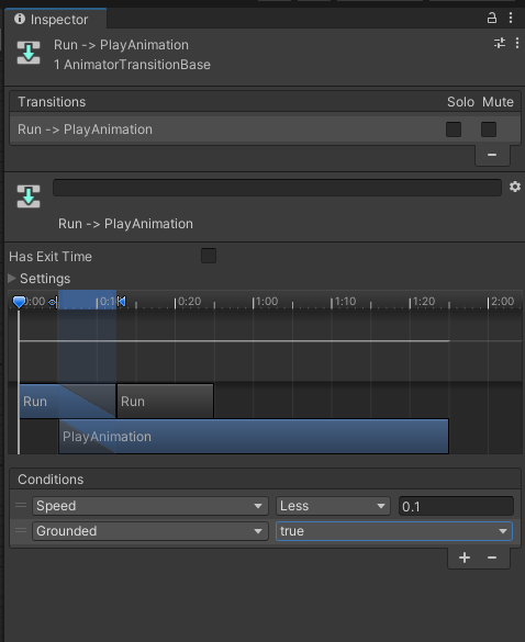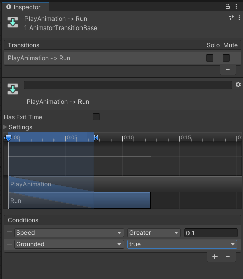 51 คลิกขวาที่ Run เลือก Mark Transition ลากเส้นกลับไปวางที่ PlayAnimation คลิกที่เส้น และที่ Inspector ที่ช่อง Has Exit Time ให้เช็คเครื่องหมายถูกทิ้ง ที่ Conditions ที่ Speed เปลี่ยน Greater เป็น Less ปรับจาก 0 เป็น 0.1 (ตัวละครเดินย้อนกลับ) คลิกที่ + เปลี่ยนจาก Speed เป็น Grounded และ true (อยู่บนพื้นเท่านั้น ถึงทำงานได้)