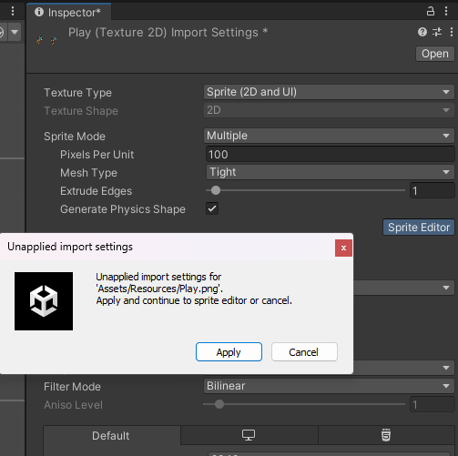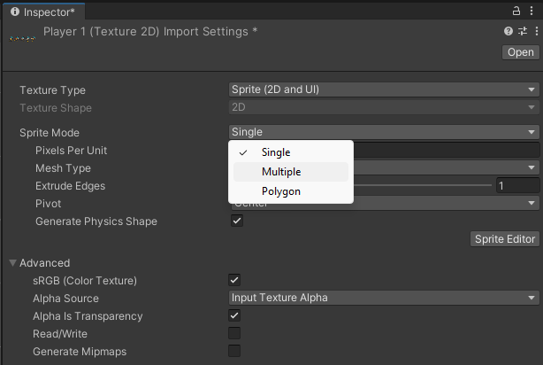 6 ทางขวามือที่ Inspector ช่อง Sprite Mode เปลี่ยนจาก Single เป็น Multiple คลิก Apply