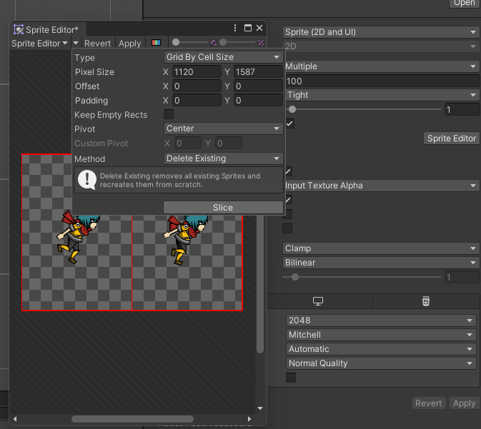 7 คลิกที่ปุ่ม Sprite Editor คลิกที่ลูกศร ช่อง Type Grid By Cell Size ปรับเส้นกริดให้เท่ากันทุกรูป (ตามขนาดตัวละครที่เลือกมา)ปรับขนาดได้แล้วคลิกปุ่ม Slice และคลิกที่แถบ Apply จากนั้นกากบาทปิดหน้าต่าง