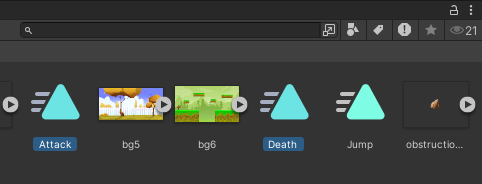 4 ที่โฟลเดอร์ Resources ด้านล่างโปรแกรม คลิกซ้ายค้างที่ตัว Attack และ Death ลากไปวางบนหน้าต่าง Animator