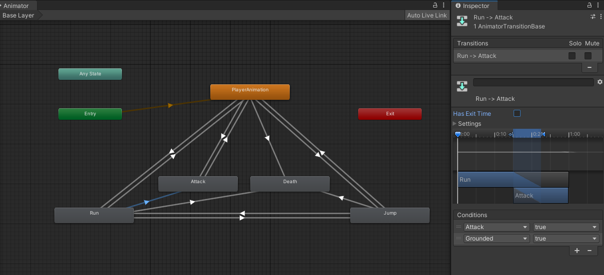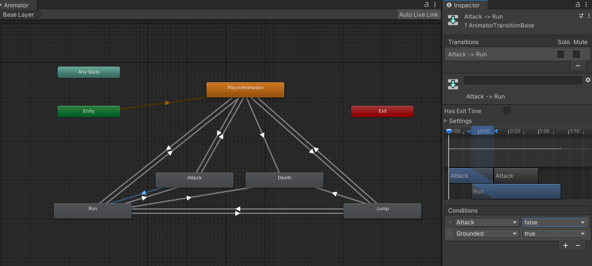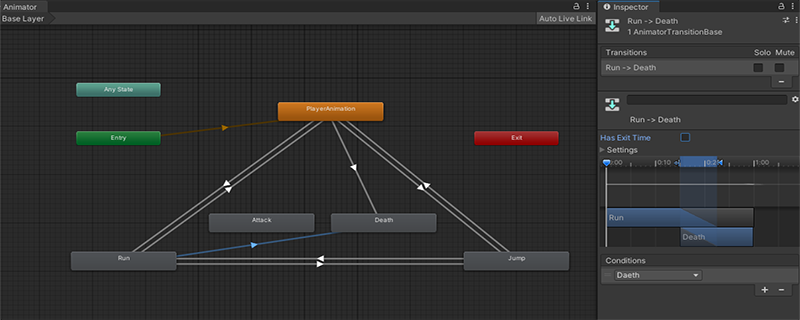 6 คลิกขวาที่ Run เลือก Mark Transition จะเกิดเส้น ลากเส้นมาวางที่ Death คลิกที่เส้น และที่ Inspector ที่ช่อง Has Exit Time ให้เช็คเครื่องหมายถูกทิ้ง ที่ Conditions เลือก Death