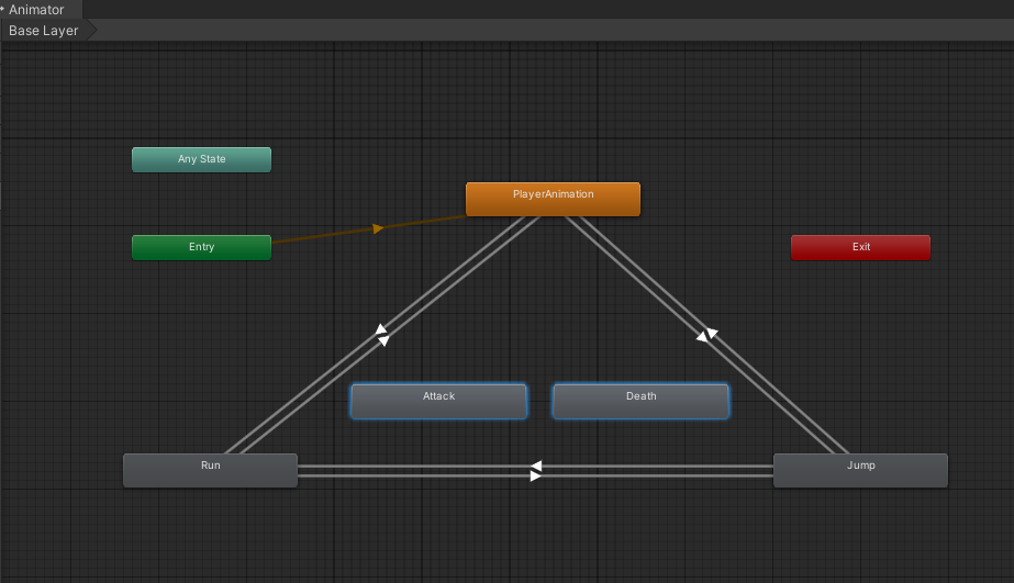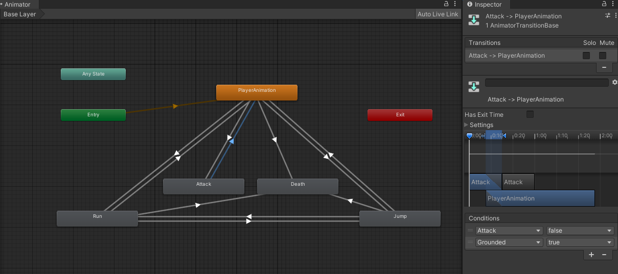 7 คลิกขวาที่ Jump เลือก Mark Transition จะเกิดเส้น ลากเส้นมาวางที่ Death คลิกที่เส้น และที่ Inspector ที่ช่อง Has Exit Time ให้เช็คเครื่องหมายถูกทิ้ง ที่ Conditions เลือก Death