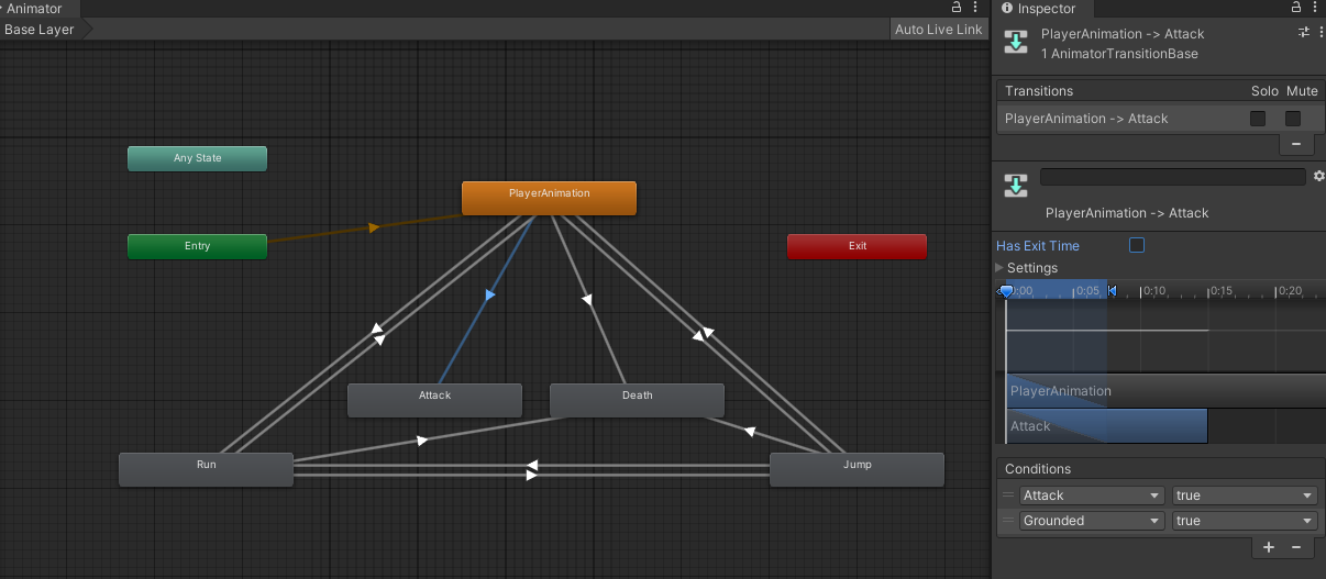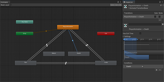 5 คลิกขวาที่ PlayAnimation เลือก Mark Transition จะเกิดเส้น ลากเส้นมาวางที่ Death คลิกที่เส้น และที่ Inspector ที่ช่อง Has Exit Time ให้เช็คเครื่องหมายถูกทิ้ง ที่ Conditions เลือก Death