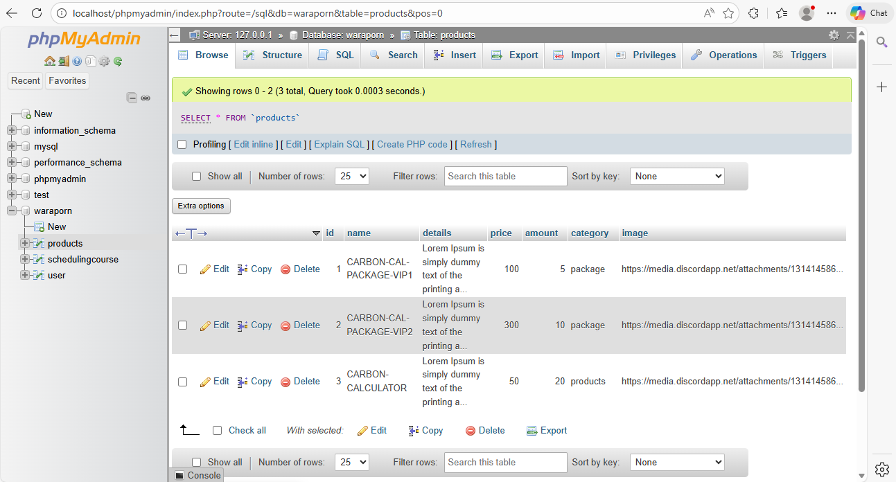 1.2 เปิด phpmyadmin ที่ Database ของคุณ Emport ตาราง ชื่อ products (สามารถ Download file ตารางที่สร้างสำเร็จแล้ว ได้จากไดร์ฟ ที่โฟลเดอร์ใบงาน)