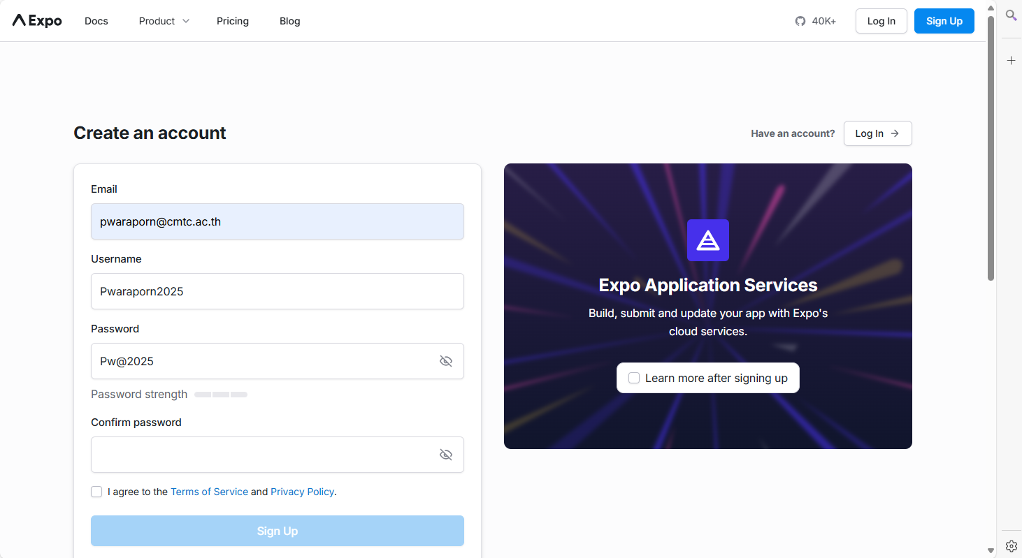 1.2 กรอกข้อมูล Email Username และ Password ให้ครบถ้วน จากนั้นคลิก Sign Up
