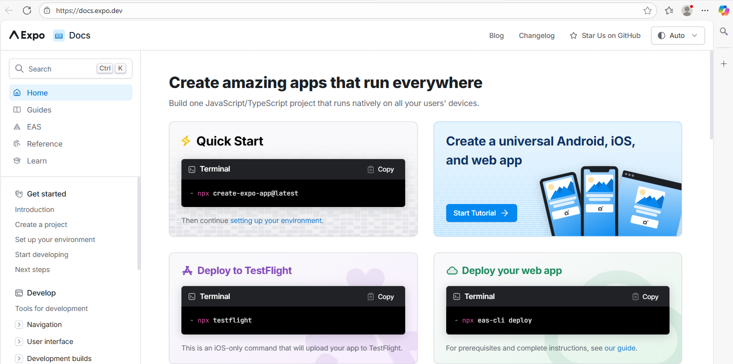 1.4 คลิกที่เมนู Docs ด้านบนซ้าย เพื่อเรียกใช้ docs.expo.dev