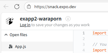 2.1 หลังจากคลิกที่ Try Expo in your browser จะปรากฎหน้าต่าง https://snack.expo.dev เพื่อสร้าง project ดังรูป