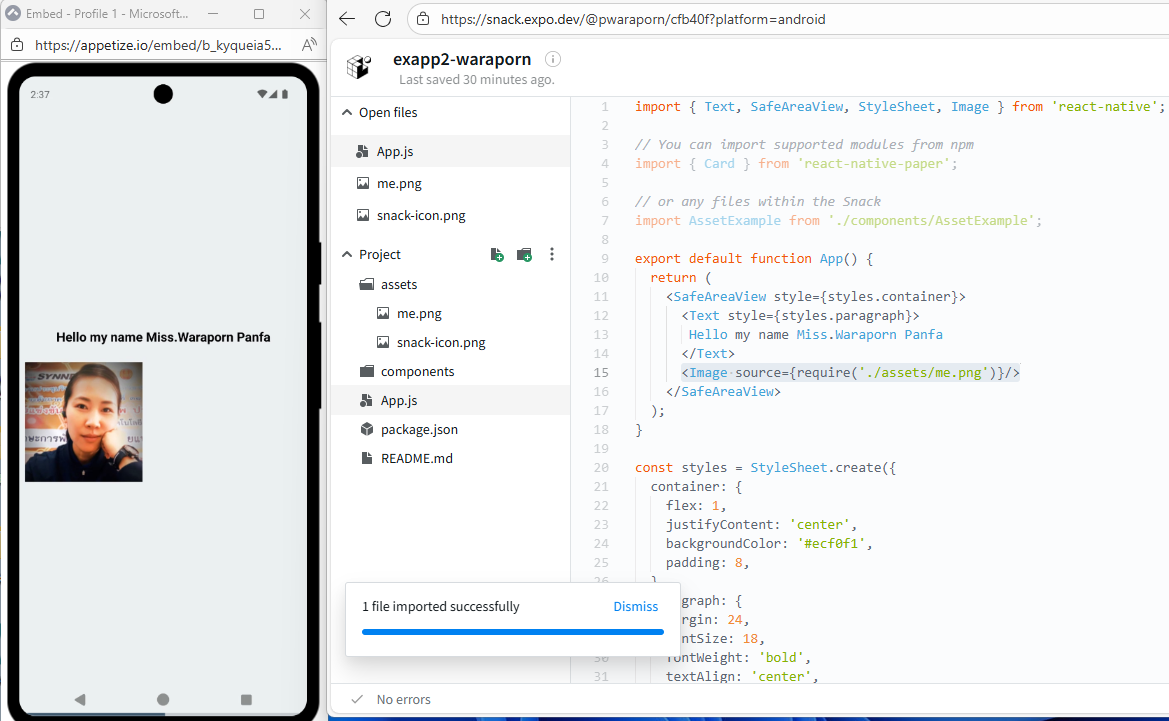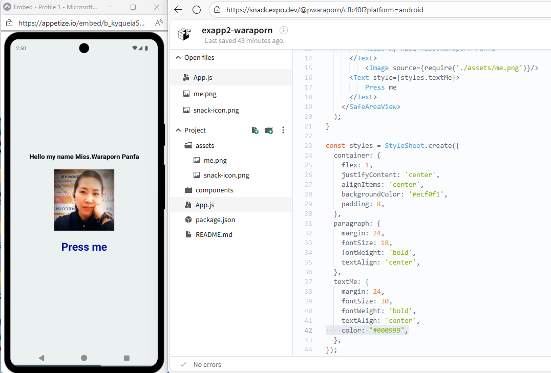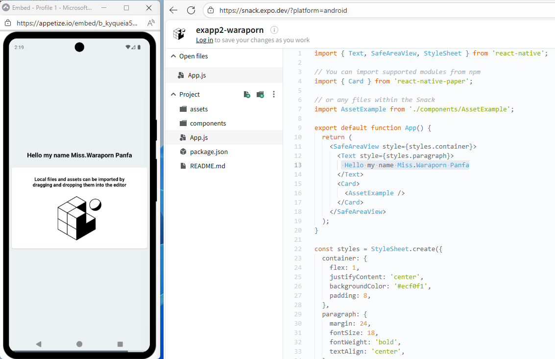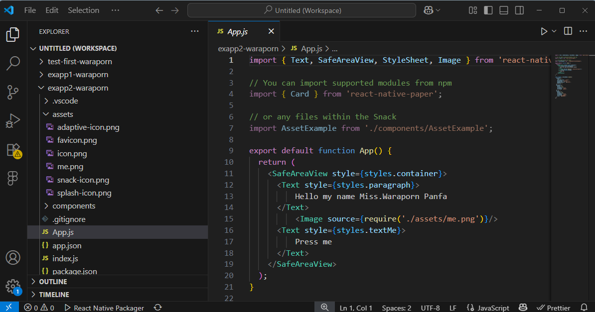 2.4 เปิดไฟล์ App.js ขึ้นมาแล้วแก้โค๊ด line ที่ 13 พร้อมเปลี่ยนเป็นชื่อของนักศึกษา