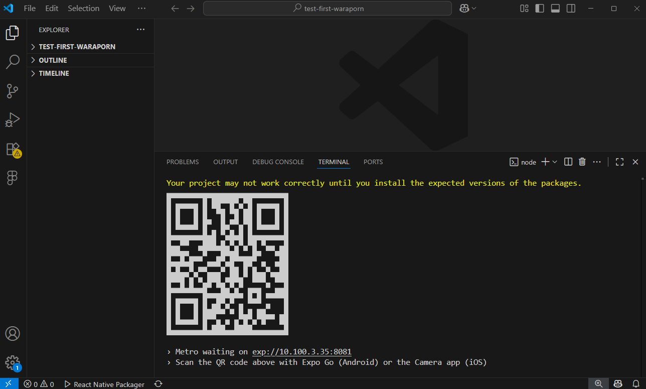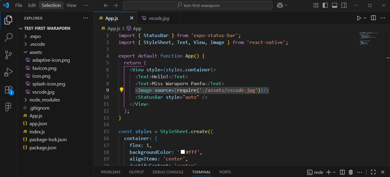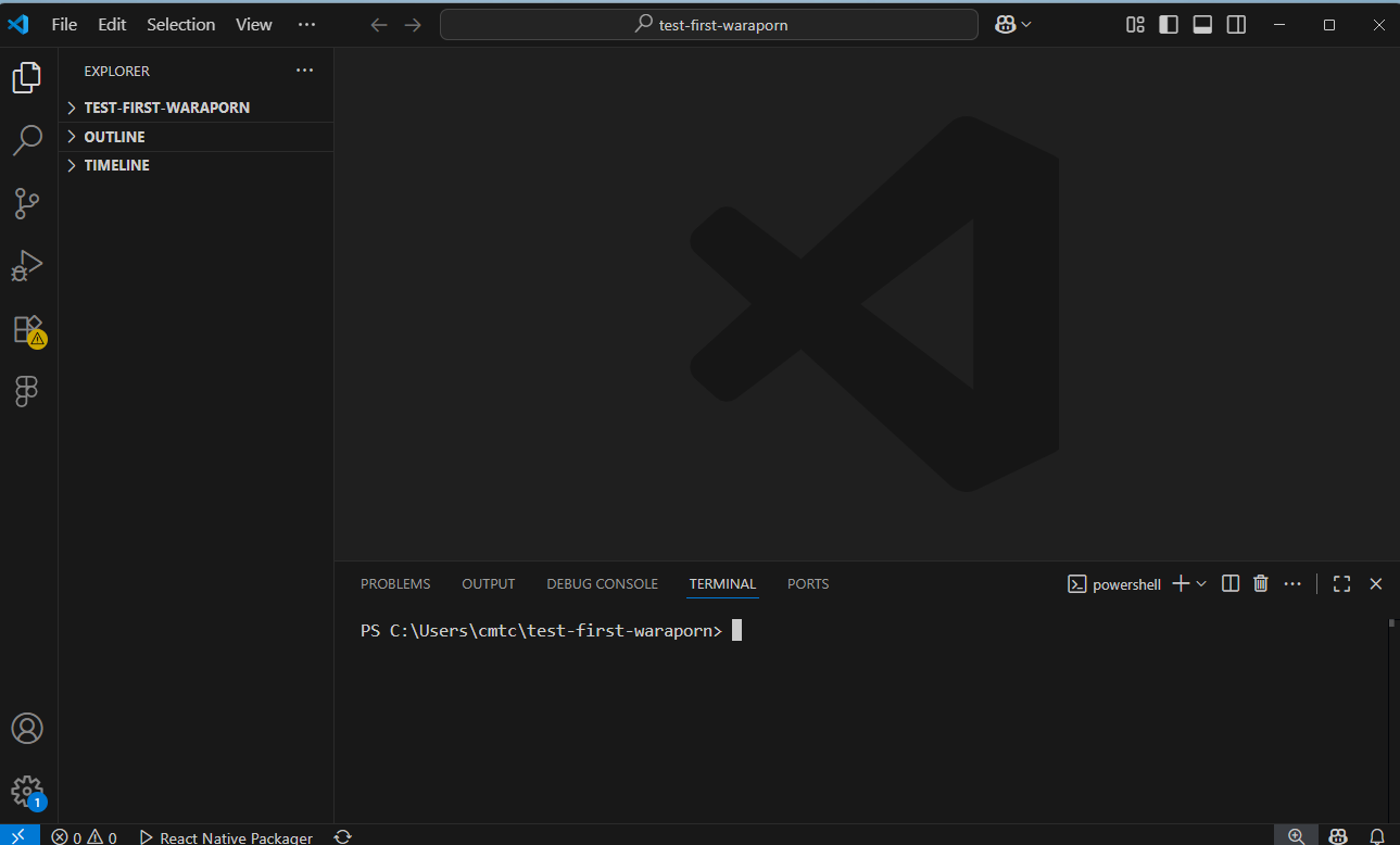 1.1 เปิด VS Code และเรียกโปรเจคที่ทำไว้ในใบงานก่อน ไปที่คำสั่ง View เลือก Terminal หน้าต่าง Terminal จะปรากฎด้านล่าง และแสดงพาธที่อยู่ของโปรเจค C:\Users\cmtc\test-first-waraporn (แล้วแต่พาธที่คุณเลือกไว้)