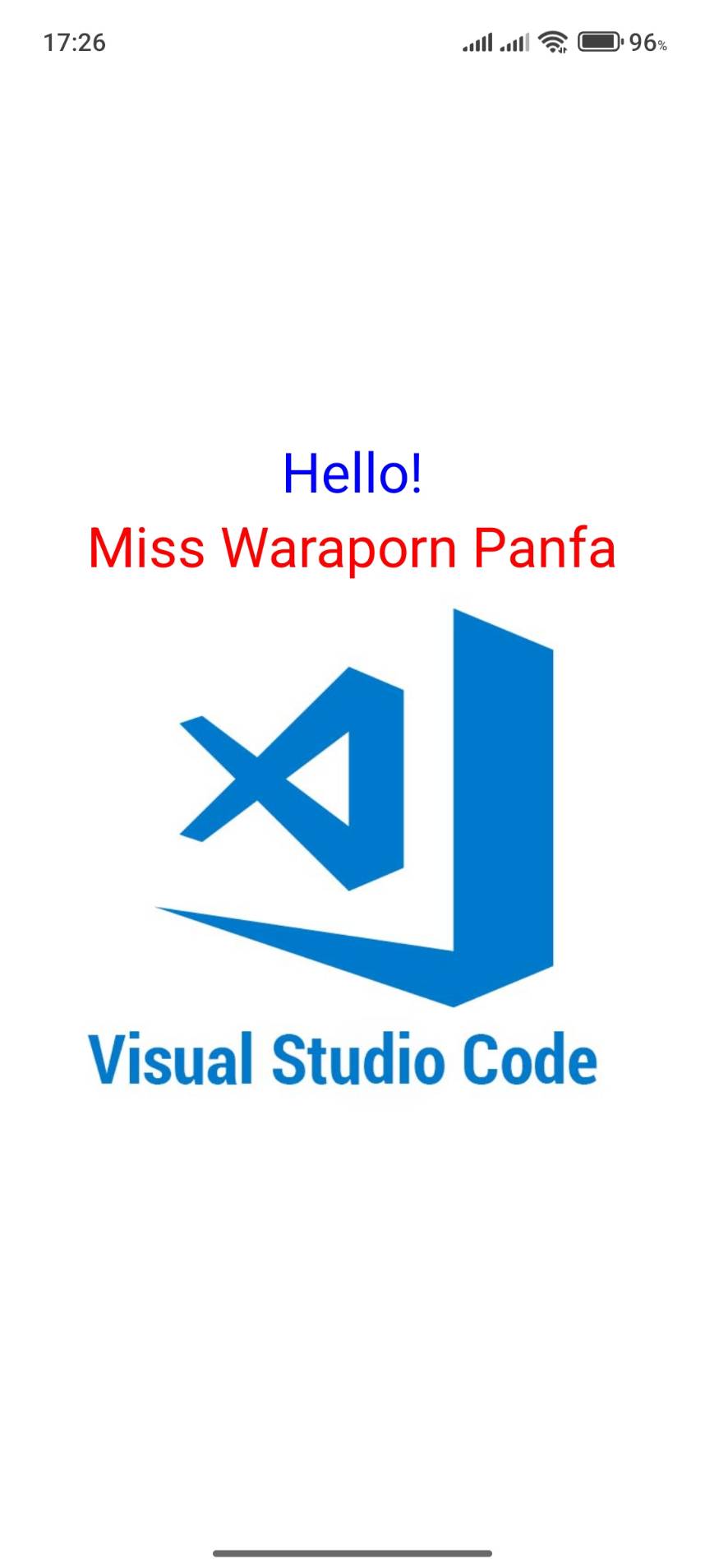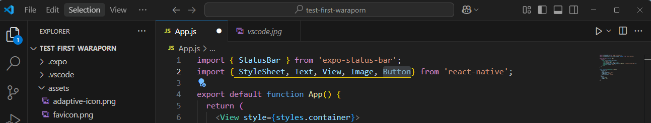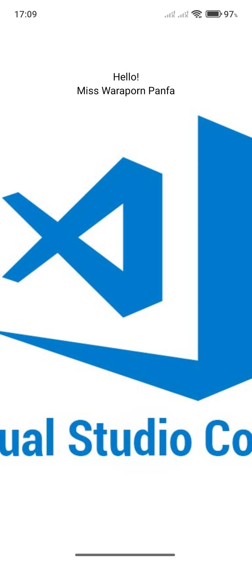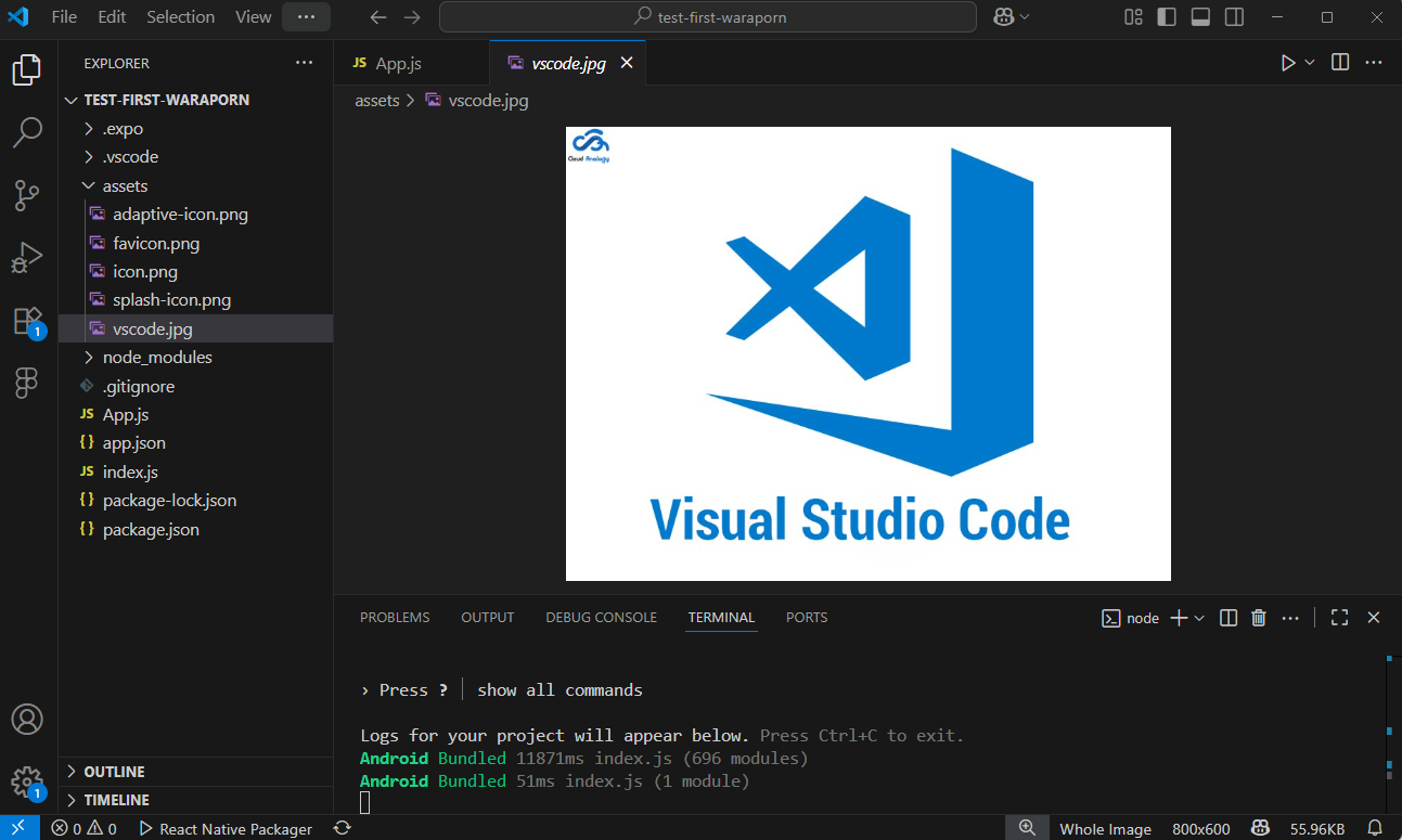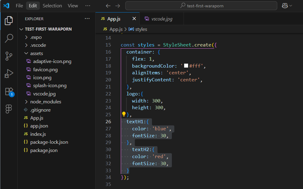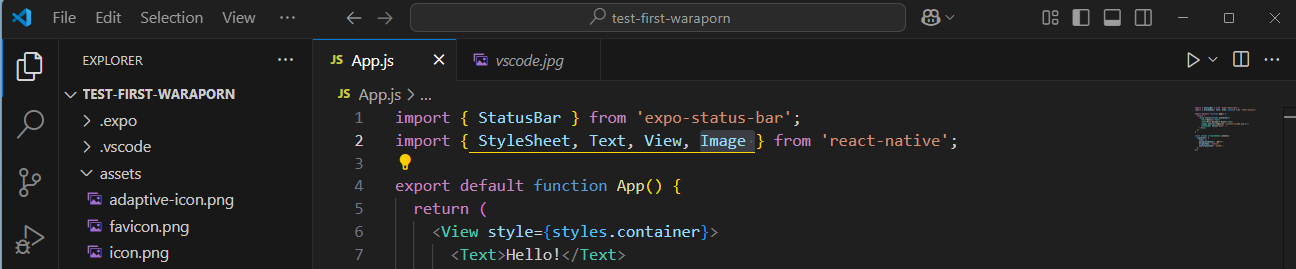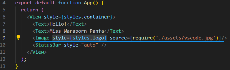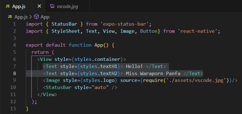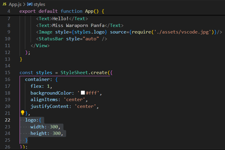 2.6 จะเห็นได้ว่าไฟล์รูปมีขนาดใหญ่เกินไป ต้องทำการปรับลดให้เหมาะสมกับหน้าจอแอพ โดยตั้งชื่อพร๊อพเพอร์ตี้ชื่อ logo เพื่อระบุขนาดของรูป และเรียกใช้งาน StyleSheet (line 9 และ 12)