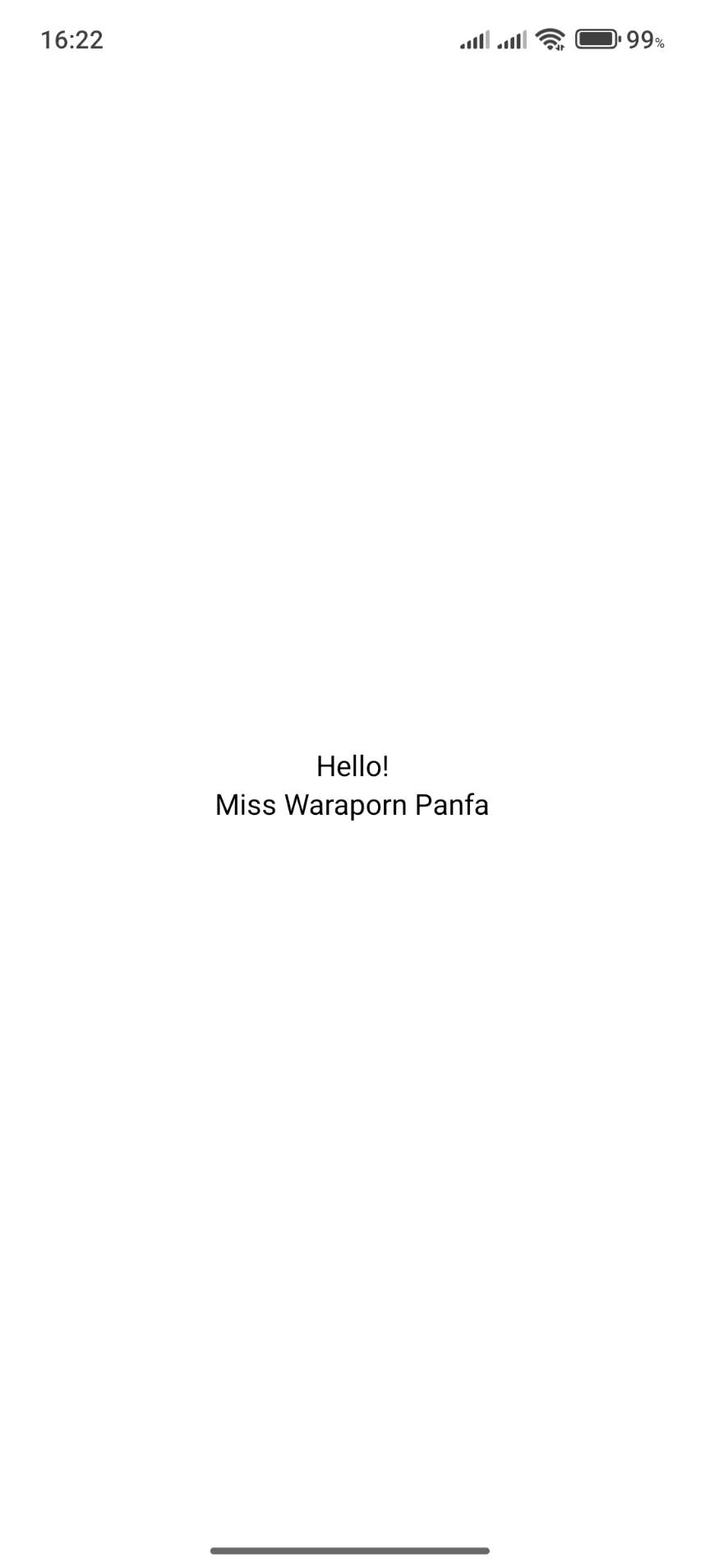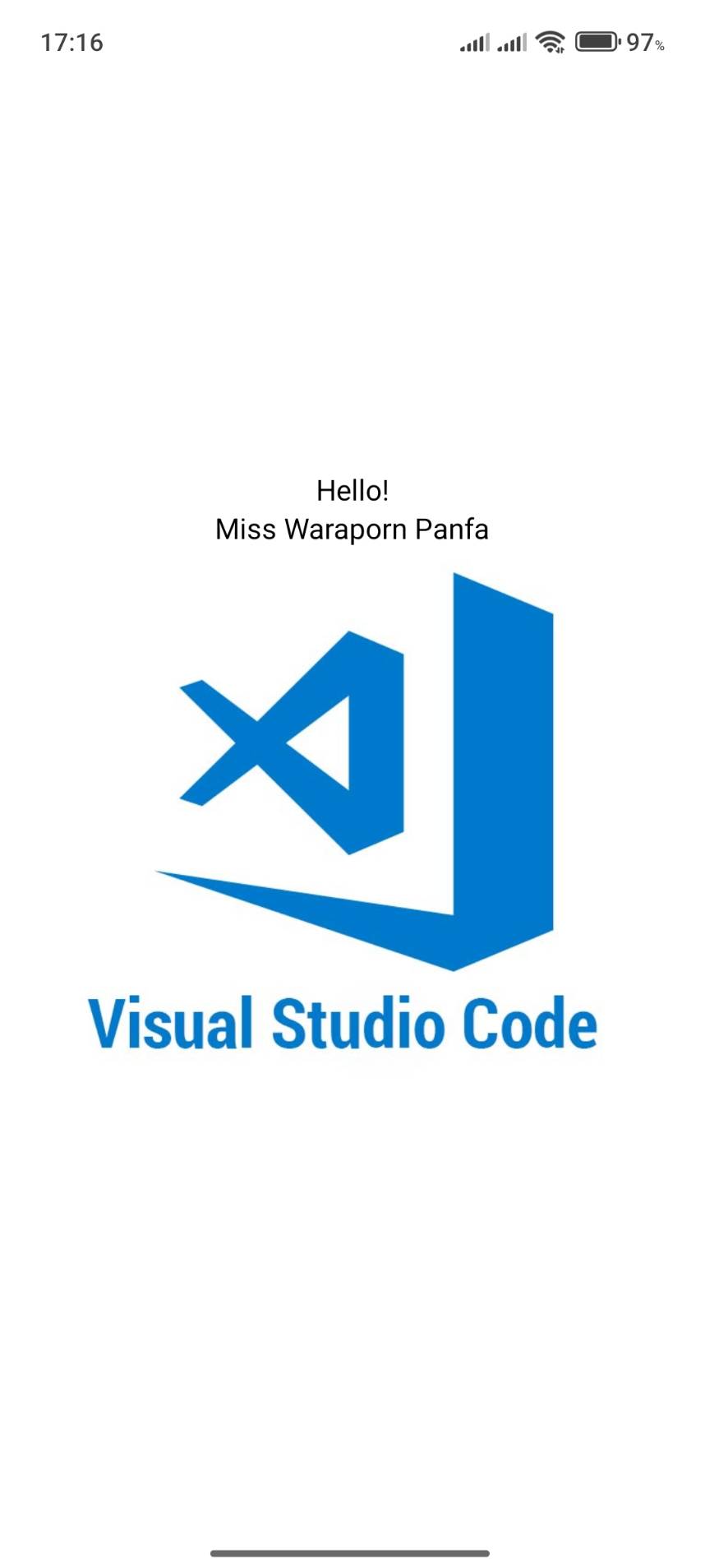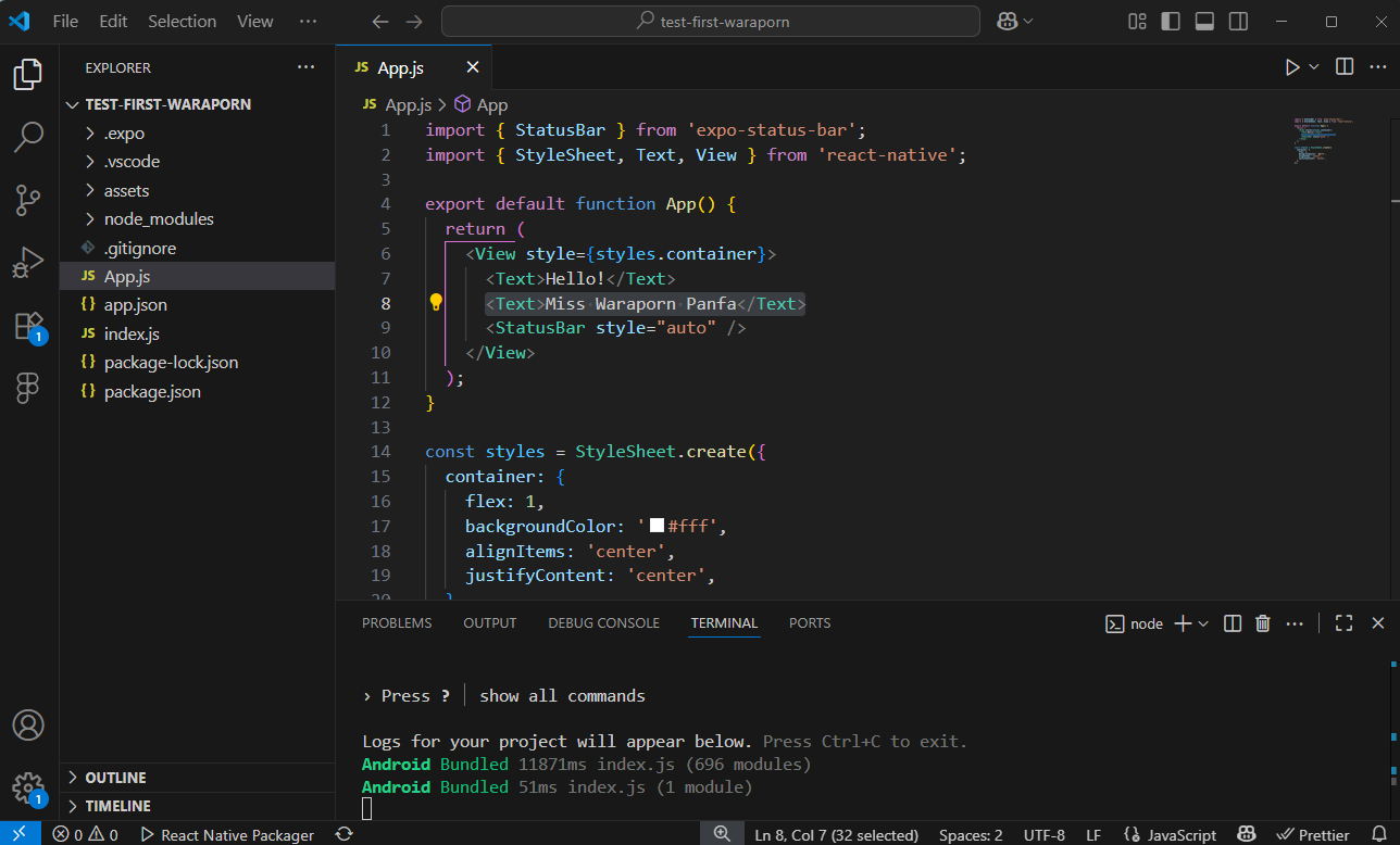 2.1 ที่โปรเจคบน VScode เปิดไฟล์ App.js ขึ้นมา จากนั้นเพิ่มข้อความที่ line 8 (เป็นชื่อคุณเอง ตัวอย่างนี้ใช้ Miss Waraporn Panfa) ดังรูป