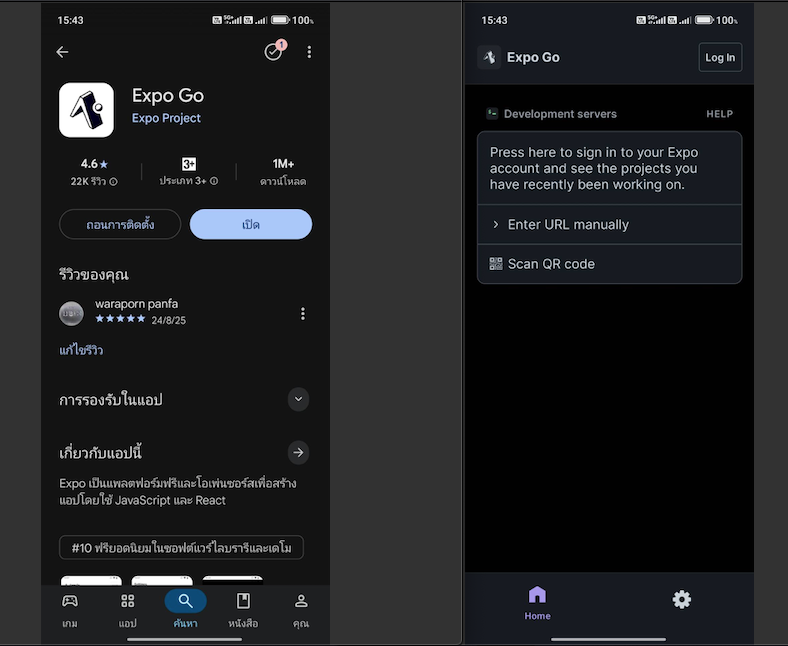 1.4 ดาวน์โหลดแอพ Expo Go บน App Store หรือ Play Store (ใบงานนี้ใช้ expo sdk 54)