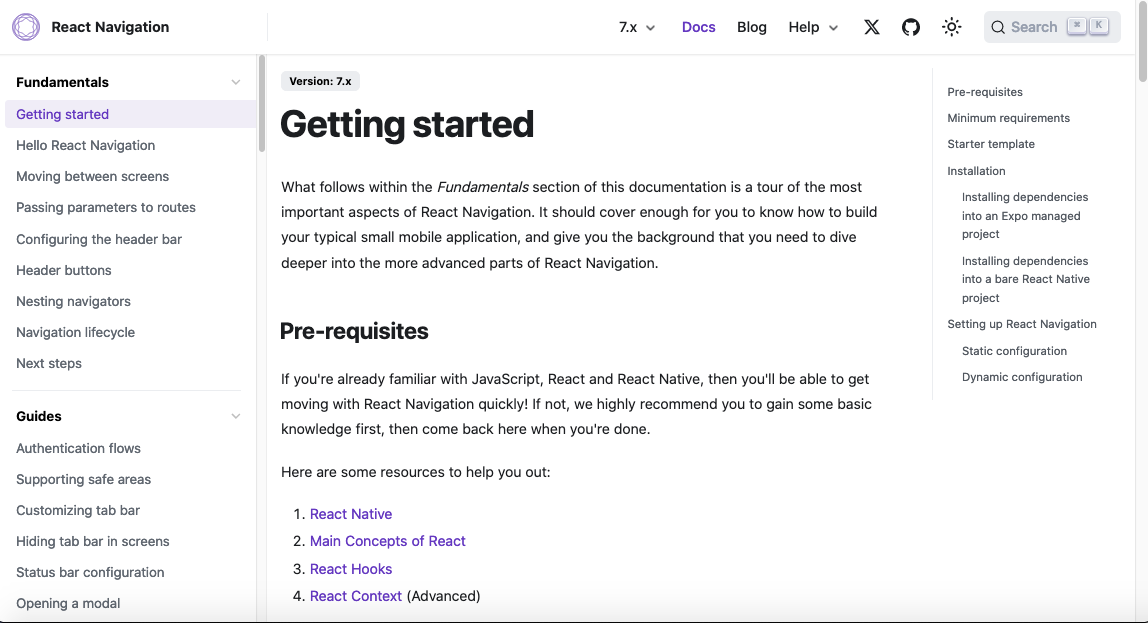 1.1 ไปที่เว็บไซต์ http://reactnavigation.org ซึ่งปัจจุบันเป็นเวอร์ชัน 7.x จากนั้นคลิกที่เมนู Docs เพื่อดูเอกสารประกอบการใช้งาน (เอาไว้ดูฟอร์แมตและก๊อปโค๊ดค่ะ 555)