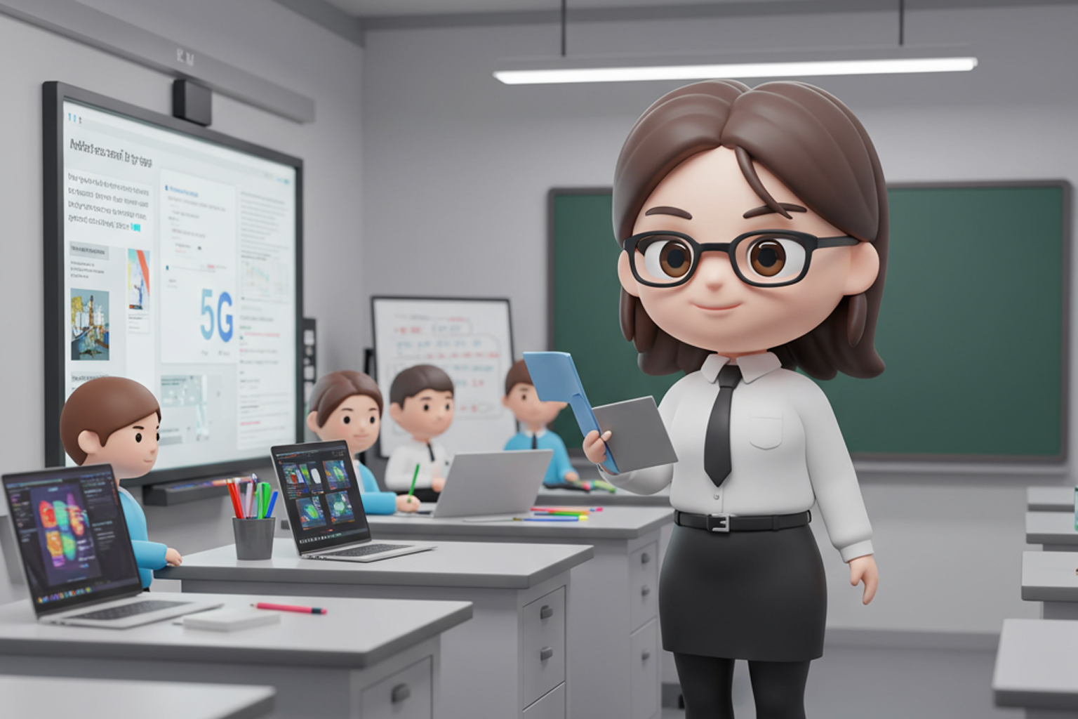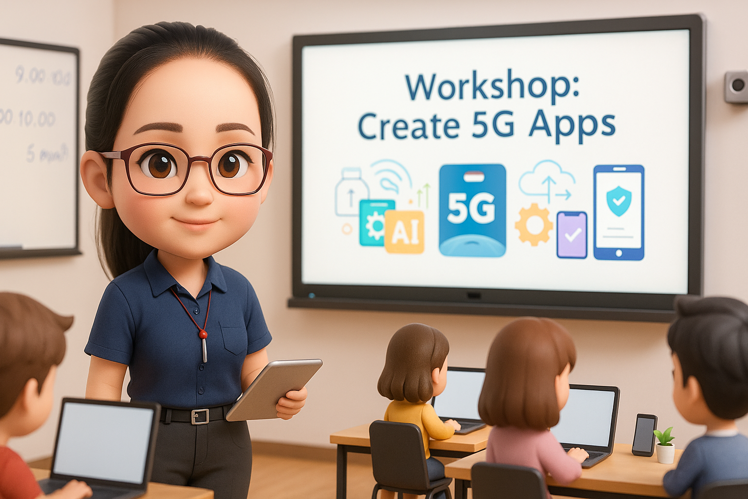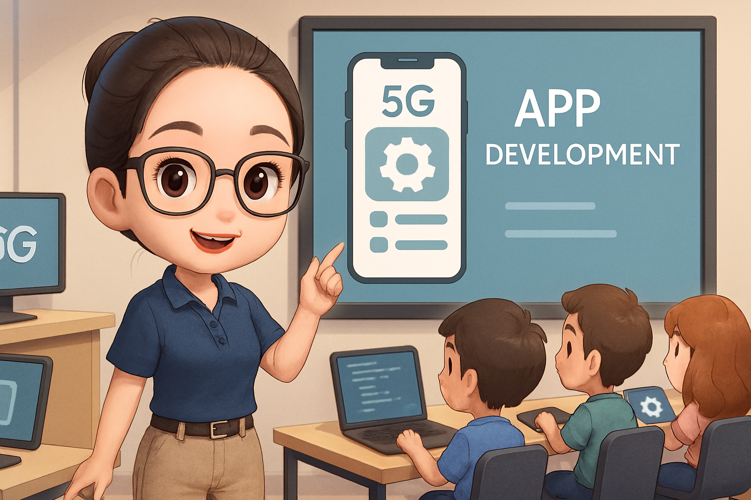 ครูอาชีวะหญิงในรูปแบบการ์ตูน 3D สุดน่ารัก สวมใส่ชุดสไต์ครูไอทีสาว ยีนอยู่ในห้องเรียนห้องปฏิบัติการพร้อมสื่อยุคใหม่ เป็นเวิร์กช๊อปเนื้อหาเกี่ยวกับการสร้างแอพพลิเคชันรองรับ 5G มีผู้เรียน 4 คน มีหน้าจออัจฉริยะสำหรับช่วยสอน แสงนุ่มนวล ตัวละครแสดงให้เห็นเต็มตัวในสัดส่วนแบบจิบิ (หัวโตตัวเล็ก) ในอัตราส่วนภาพ 16:9 3.1 ใหันักศึกษาระบุ prompt ด้วยตัวเอง เพื่อให้ AI ทำงานด้วย ChatGPT