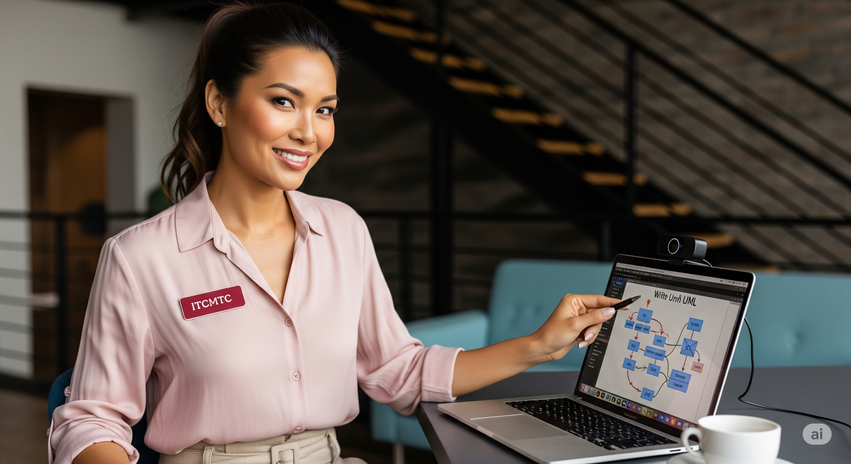 ท่าทาง: มองตรงไปที่กล้อง นั่งสอนออนไลน์ สาธิตการเขียนแบบ UML ด้วย macbook pro ขนาดจอ 13 นิ้ว พร้องกล้องเว็บแคมสำหรับสอน