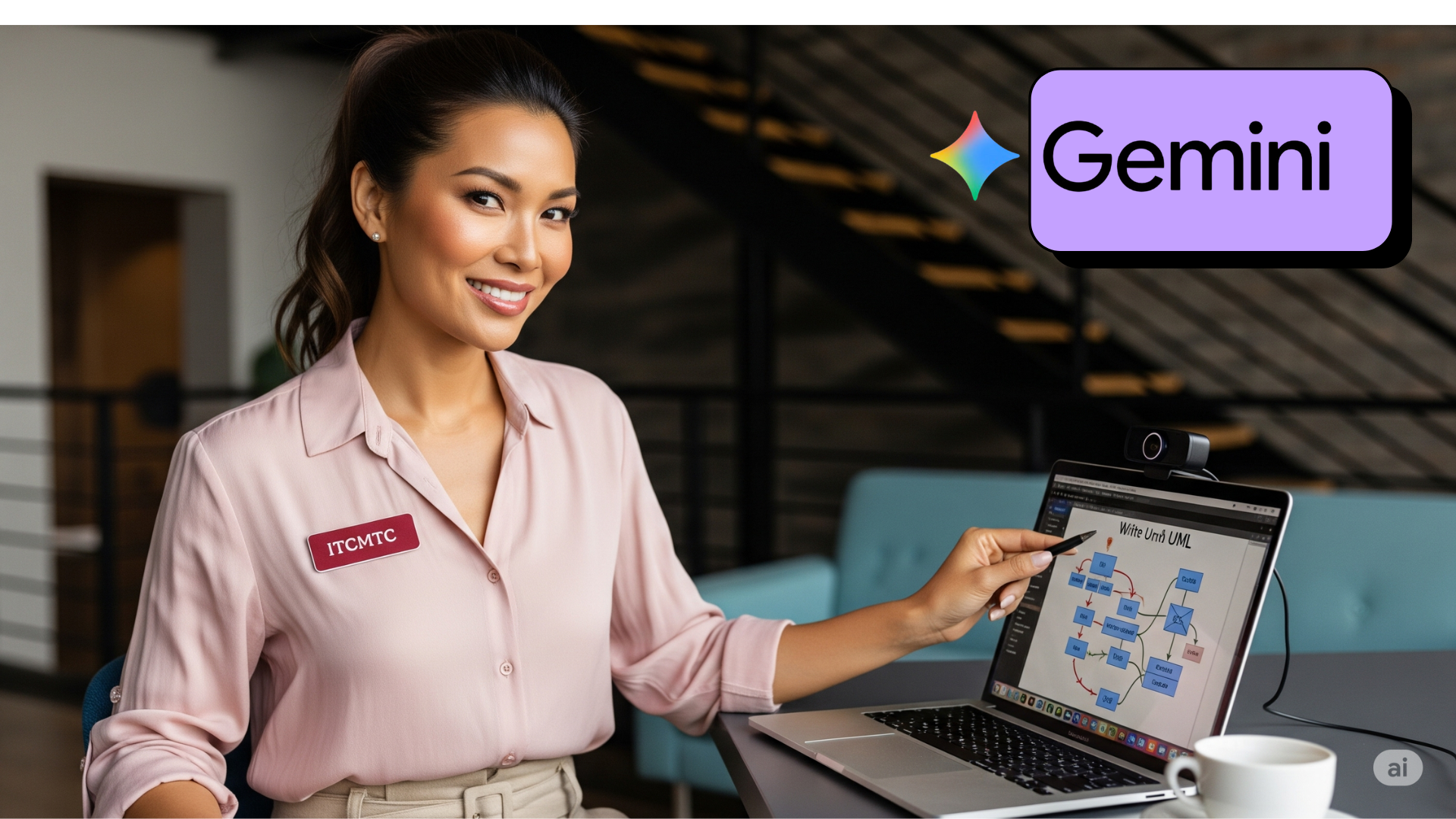 ท่าทาง: มองตรงไปที่กล้อง นั่งสอนออนไลน์ สาธิตการเขียนแบบ UML ด้วย macbook pro ขนาดจอ 13 นิ้ว พร้องกล้องเว็บแคมสำหรับสอน
