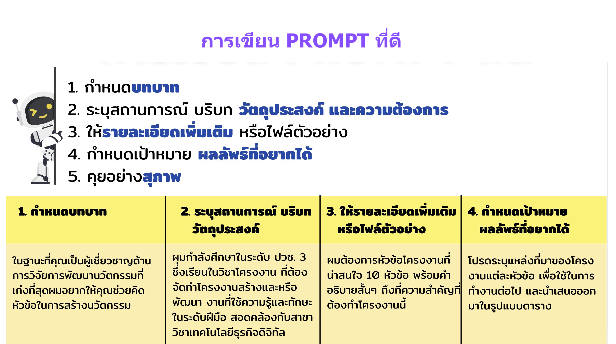 Prompt หมายถึง คำสั่ง หรือคำถามที่ใช้สำหรับสื่อสารกับ Generative AI โดยการเขียน Prompt ที่ดีจะช่วยให้ AI สามารถให้คำตอบที่ตรงกับความต้องการของผู้ใช้มากขึ้น การเรียนรู้เทคนิคการเขียน Prompt จึงเป็นสิ่งจำเป็นสำหรับผู้ที่ต้องการใช้ AI อย่างมีประสิทธิภาพ